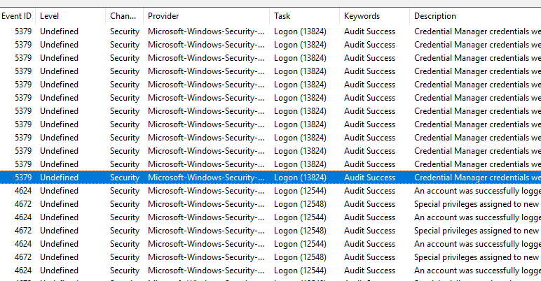 When reviewing security.txt, we found that every event — even logon events — had the same category: User Account Management
