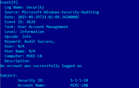$Events = Get-WinEvent -LogName Security -MaxEvents 30